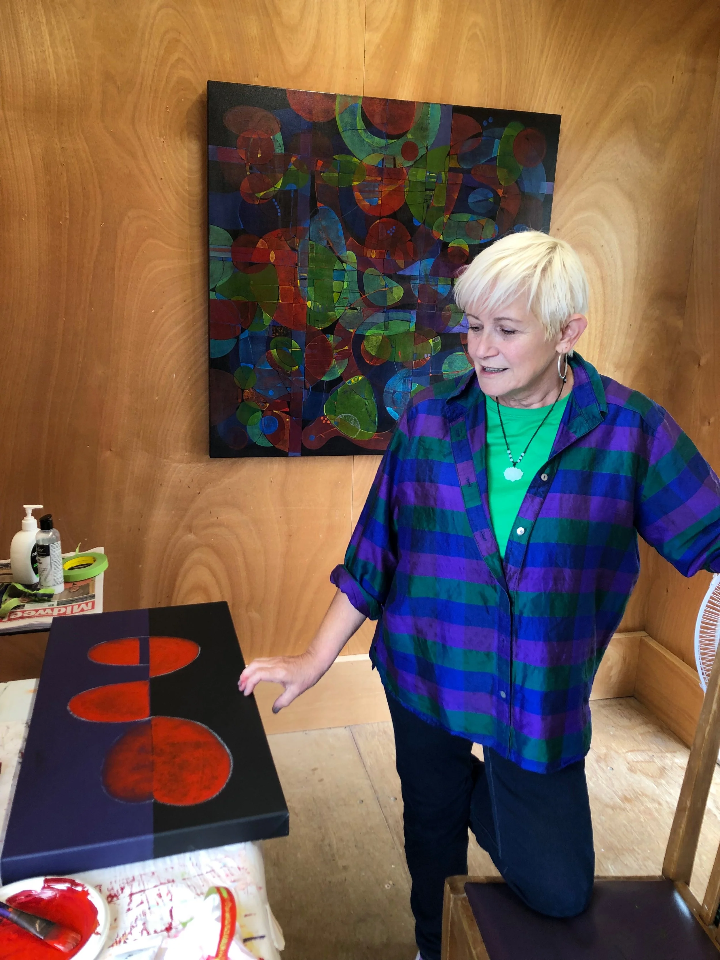 Dazzling colourful abstract paintings by Karen Madoc are in Studio 1 during January, accompanied by the work of potter Kate Hepburn. Karen will be in residence occasionally, but if you’d like to arrange a time to meet her, please let us know.
